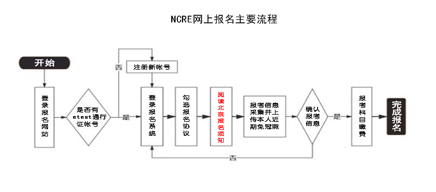 北京考生登錄全國(guó)計(jì)算機(jī)等級(jí)考試報(bào)名網(wǎng)站(網(wǎng)址:https://ncre-bm.neea.cn),點(diǎn)擊“(11)北京市”報(bào)名入口進(jìn)行網(wǎng)上報(bào)名。考生若已有賬號(hào),可直接登錄報(bào)名;若沒有賬號(hào),需通過“ETEST通行證”網(wǎng)站進(jìn)行注冊(cè)。考生登錄報(bào)名網(wǎng)站后,須首先閱讀“省通告:北京市NCRE報(bào)名須知”等公告,知悉并遵照相關(guān)要求,按照網(wǎng)頁(yè)提示完成信息填寫、照片上傳和繳費(fèi)。